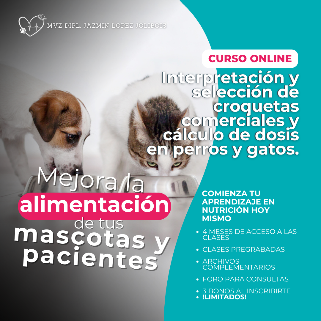 Interpretación y selección de croquetas comerciales y cálculo de dósis en perros y gatos.